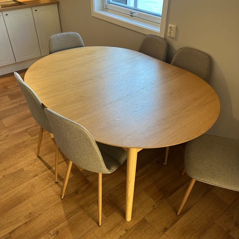 Stolene er solide, komfortable og passer både til spisebordet og som ekstra sitteplasser i stua. Ingen merker, flekker eller slitasje.