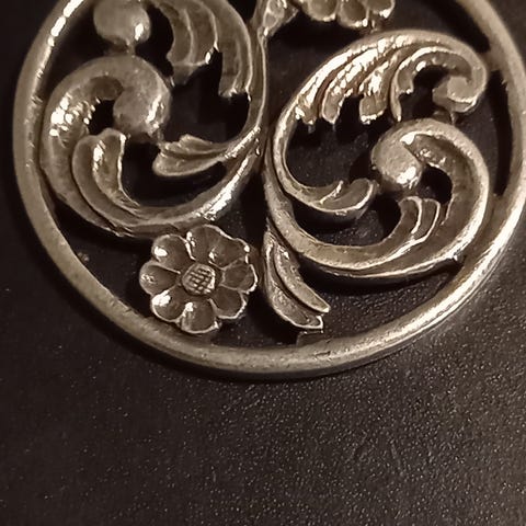 Sølv Dame Anheng laget i sølv med dekorative utskjæringer av blomster og en stjerne på baksiden. Anhenget har et rundt design og passer som smykke for damer.