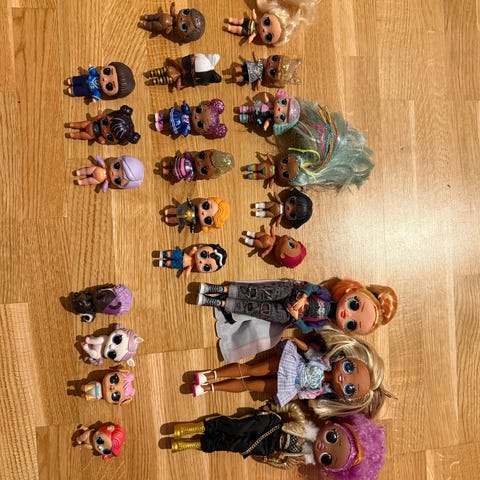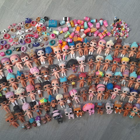 Det var 4 l.o.l dukker totalt i orginal settet som kostet ca 300kr, men jeg kastet 5 extra l.o.l dukker sammen med resten.