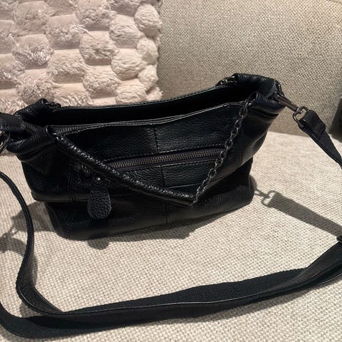 Vesken er godt brukt. Noen løse tråder i sømmen på skulderreimene, og vesken er noe deformert etter lagring. Mulig det lar seg fikse, men har ikke prøvd selv.