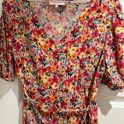 byTiMo Sommerkjole i størrelse M . Kjolen er flerfarget med blomsterprint og laget av silkemateriale. Den har kort erm og en v-formet utringning.