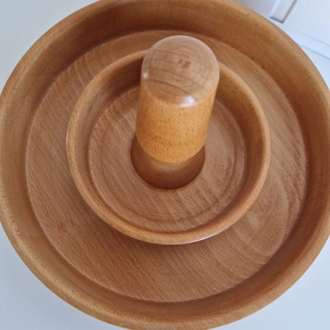 Treskjært treskål med dekorative utskjæringer langs kanten. Skålen er laget av tre og har en naturlig trestruktur og farge. Medfølgende tang i metall med håndtak i lyst materiale. Egnet for servering eller dekorative formål.