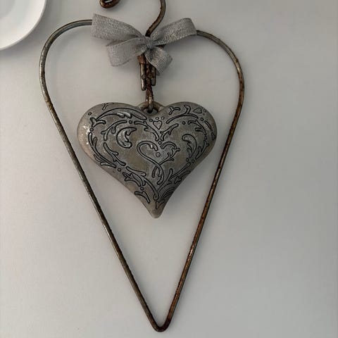 Selger dette hjerte speilet som har hengt pent i gangen uten egentlig å blitt rørt.. lappen har henget på siden bak mens den hang der. Den har ikke blitt flyttet eller gjort noe med. Har en vintage stil preg over seg av design. Har stearinlys som ikke har vært tent som vil følge med den.