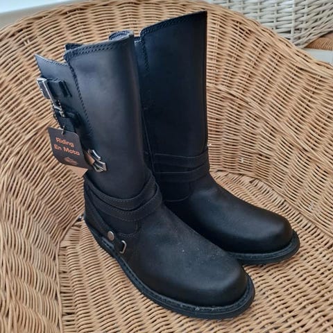 Harley-Davidson støvler i brun skinn, størrelse 40. Støvlene har spenner som dekorative og funksjonelle elementer. Veldig kult brukt og slitt. Ny såle.