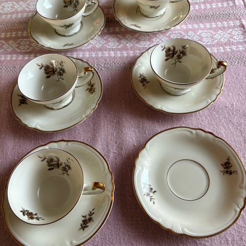 10 sett kaffe/te. Fat: diameter 17cm, skål diameter 14 cm, kopp høyde 5,5 cm og diameter 9cm. Ikke sterk farge på koppene, se bilde. Kan sendes, kjøper betaler frakt.