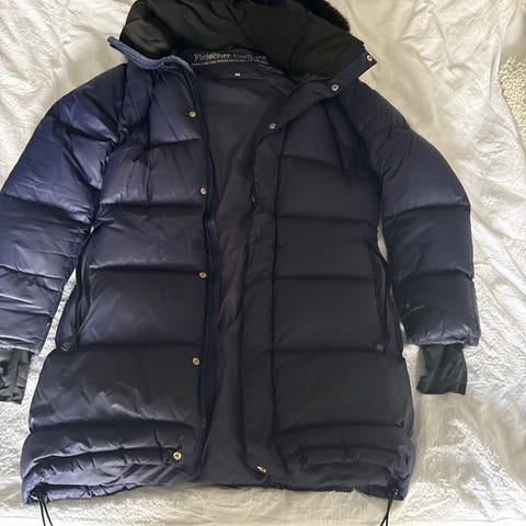 Deilig varm norsk dunjakke. 90% gåsedun, 10% fjær. Såvidt brukt, men var uheldig å få rift i ene jkkeermet. Selges derfor billig. Det er et strakt rift- og kantene lar seg lett føre sammen.(ser ikke sånn ut på bildet, da dunjakken er veldig puffy og ubrukt). Bittelitt rift ved siden av, sees på bilder.