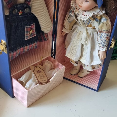 Original Perfect Home Collection Mariell dukke med blå kjole og brunt krøllet hår. Dukken har detaljerte ansiktstrekk og klær i stoff med blonder. Passer som samlerobjekt eller dekorasjon. Dukke nr 2 heter Hanne og er en sittedukke. Detaljerte ansikt trekk og nydelig kjole, sko og sokker. Den nr 3 er kortet borte på. Men søt utgave med bamse , og Alle 3 hører til perfect home collection. Alle 3 selges samlet for kr 500.