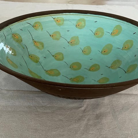 Vakker bolle i keramikk av Nina von Krogh. Høyde ca 16 cm, omkrets ca 25 cm. Fargen er gul med grønne og noen lyse innslag, den blir ikke helt riktig gjengitt på bildene.