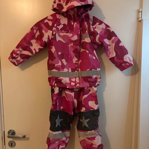 Regndressen har synlige bruksspor (se bilder), men fungerer fortsatt fint og holder barnet tørt i regnet.