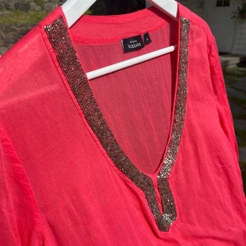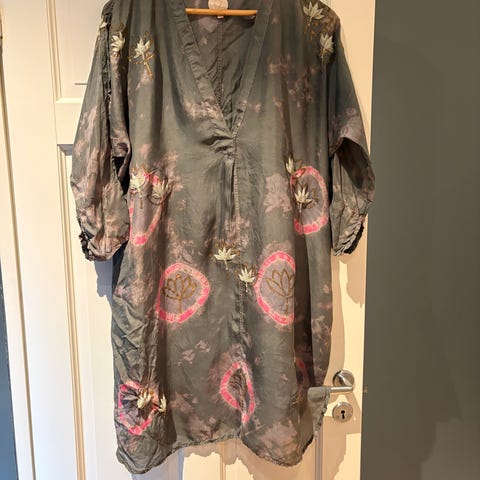 Rød kjole / tunika, med gull og glitrende detaljer, i 100% silke. Ny pris: 3800,-