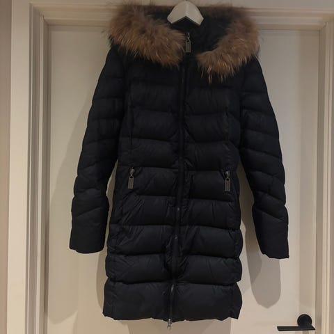 Nydelig og kjempedeilig Jean Paul dunkåpe i marineblå farge, størrelse S for dame. Jakken er laget av 90 % andedun og 10 % fjær og har avtagbar hette med avtagbar juksepelskant. Den har glidelåslommer og glidelås og knappelukking foran. Innebygget refleksbånd med trykknapp som kan henge ned bak om ønskelig. Lett innsvinget passform og pen lengde.