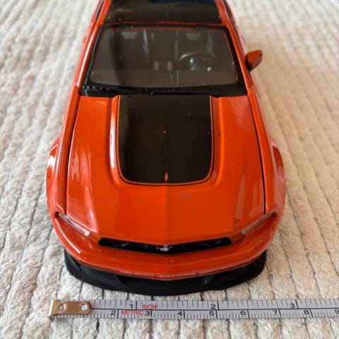 Gamal Corgi Juniors Fox body Mustang. Heil, og solid, men ber preg av lek. Lakk er sliten, og hjul har slitemerker. Sjå bileta.