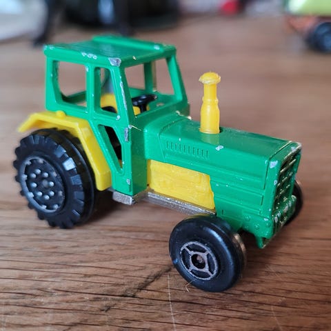 Gamal Majorette traktor. Heil, og solid, men ber preg av lek. Lakk er sliten, og hjul har slitemerker. Sjå bileta.