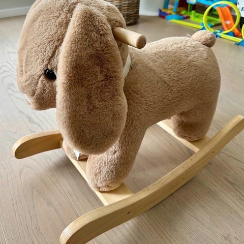 Pent brukt gyngesau hvor hjul kan vippes ned så man kan rulle avsted.