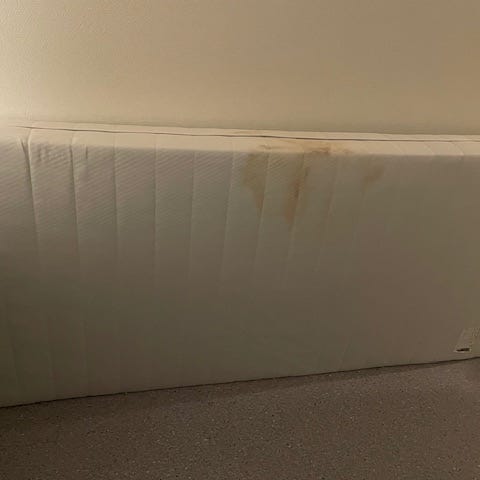 Gis bort: enkeltseng bestående av madrass og trebasert rammekonstruksjon (med lameller). Sengen står direkte på gulvet uten bein. Brukt, men fortsatt helt grei å bruke. Noen merker på trekket, se bilder.