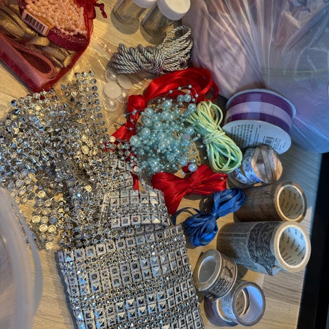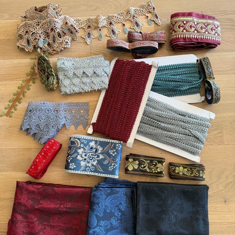 Diverse rester i enn rekke farger, materialer og stiler.Noen har forseggjorte broderier, paljetter og metalliske tråder.For en som driver med håndarbeid og er flinktil å sy. Selges samlet for kr. 100.