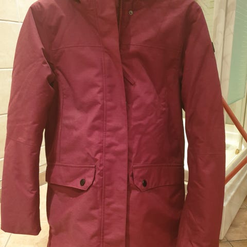 Skogstad vinterparkas med hette i nydelig burgunder farge (vanskelig å få fargen godt frem på bilder). Pels (fuskepels)rundt hetta. Snøring i livet. Som en str M.