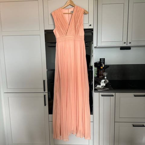 H&M festskjole i størrelse 42, laget av polyester. Kjolen har en brun farge og er designet for kvinner. Den har et plissért stoff og en åpning på ryggen.