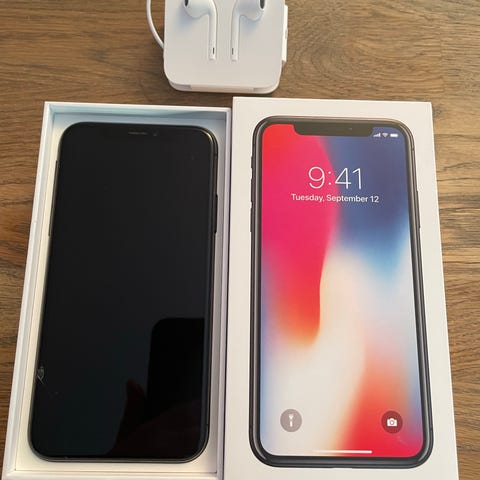 Apple iPhone X mobiltelefon med 64 GB lagringskapasitet. Enheten. Telefonen viser normale bruksspor og har funksjonell skjerm og knapper. Passer for brukere som ønsker en iPhone med mellomstor lagringsplass og moderne design. Pent brukt