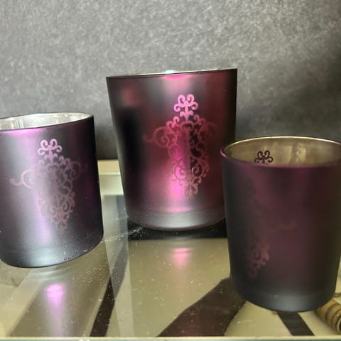 Laget av glass. Har dekorative mønstre. Passer til telys. Egnet som dekorasjon i hjemmet.