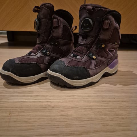 ECCO barn vinterstøvler i størrelse 28, designet for jenter. Støvlene har en lilla farge og kombinerer materialer som gir varme og beskyttelse i kaldt vær. Egnet for utendørs bruk i vinterforhold.