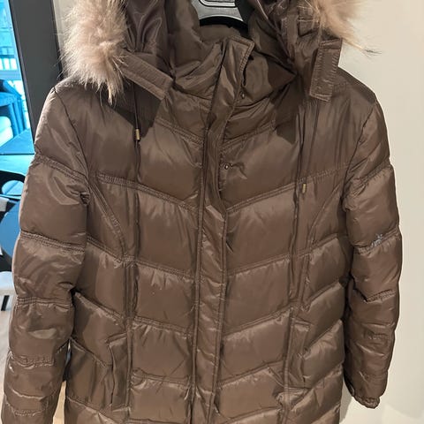 Lang varm boble vinterkåpe, Offwhite, avtagbar fuskepels hette, str 44 - 46