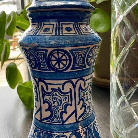 Dekorativ porselenskrukke fra Kina. Like fin med en plante i som uten.
