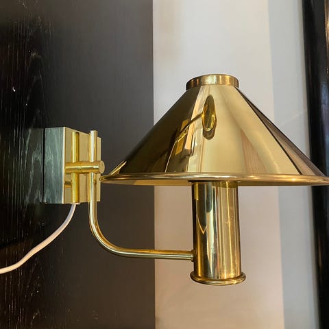 Vakker vegglampe i polert messing, med minimalt av bruksmerker fra Grønlandsserien – svært pen til å være en ekte vintage-lampe. Lampen har en sjelden grønn glasskjerm i luseglass, produsert i samarbeid med Hadeland Glassverk. Designet av Jonas Hidle og Arne Jon Jutrem