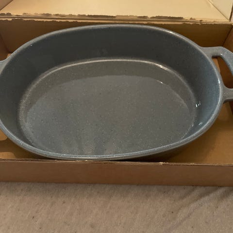 Støpejernsgryte i mørk blå fra gamle ærverdige Ribe Jernstøperi, Danmark selges. Høyde 17. Lengde 33. Bredde 26 cm.