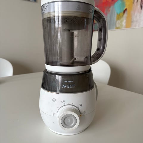 Barnematmaskin fra Philips Avent. Den er godt brukt og det syntes, men maskinen fungerer fortsatt utmerket. Føler også med en beholder for å varme opp mat man har laget tidligere.