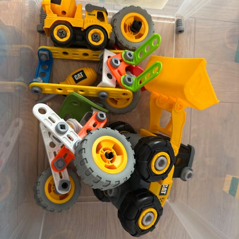 Mye forskjellig Duplo, blant annet et sett med tall-tog (10954), husdeler og et sett til å ha i badekaret (10965). Har sortert litt, men ga opp underveis fordi barna selvfølgelig vil leke med det nå som det skal selges. Mye tog her, og litt spesialklosser fra 90-tallet slik som gravemaskinen. Flere folk oppi her også, og et par store plater og noen mindre. Alt man trenger for at søsken skal leke sammen i romjulen