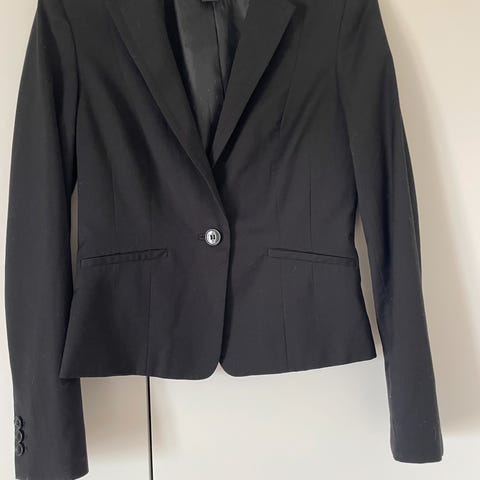 Pen sort dressjakke. Ingen merker. En knapp må byttes. Dobbeltspent. Pen fasong
