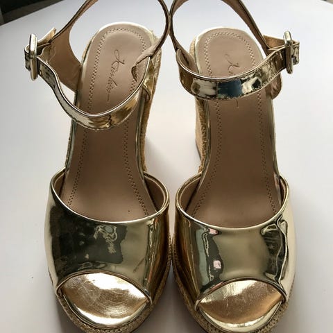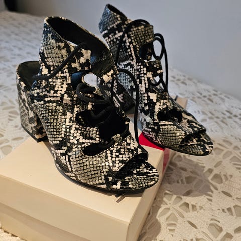 H&M hæler i størrelse 36, laget av sølvfarget skinn. Skoene har en åpen tå og en tykk blokkhæl. Designet for damebruk, egnet for formelle og uformelle anledninger.