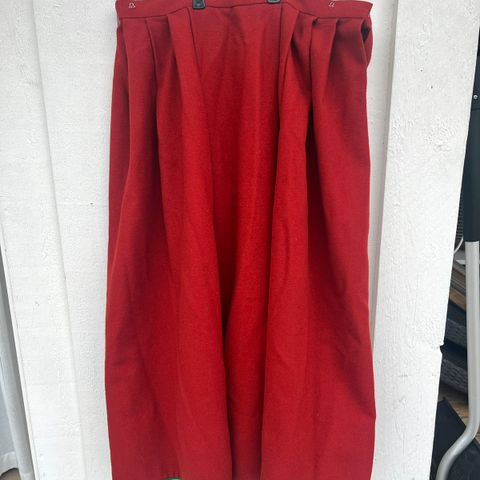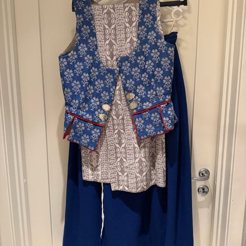Stakk til blå trønderbunad. Skulle syes ut i livet, derfor er linning og hekter ikke montert på igjen da det er lettere å tilpasse for ny eier. 119cm stoff til bruk i livet. 89 cm lang. Rynkene bak er ferdige