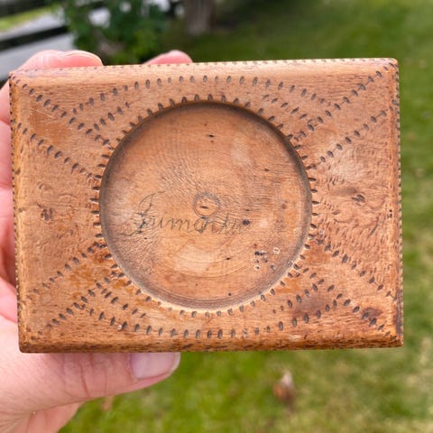 Pen utskjært hylle gammel da det står " innrisse" 11/1 -24 og O .Andersen bredde nede 31cm og bredde øverst 27cm og høyde 32 Sees på.1 bilde en liten bit borte og litt på undersida av hylla Tross alder er den godt bevart ( 100 år)