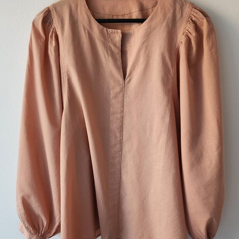Flott hjemmesydd bluse med draperte ermer som gir flott puffermeeffekt. Knapt brukt. Str 38/40. Viskose.
