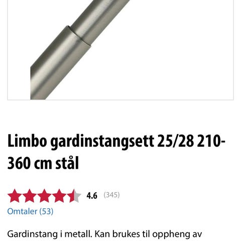 Selger en trippel gardinstangsett fra Ikea. Den er hvit. 210 - 385 cm. Alt tilbehør følger med, samt ekstra utstyr om nødvendig. Ny pris på denne er 705 kr.