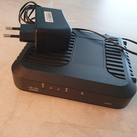 Cisco EPC3010 modem med tilkoblinger for strøm, Ethernet, USB og koaksialkabel.