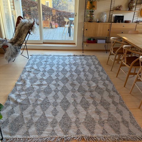 Bolia Loop gulvlampe selges. Teppe er 300 cm langt og 200 cm bredt. Det har noe slitasje der hvor føttene har vært under sofaen. På et punkt på ene langsida har en knute gått opp. Teppe et i ull. Nytt kostet teppe 14 000 kr. Bud ønskes.