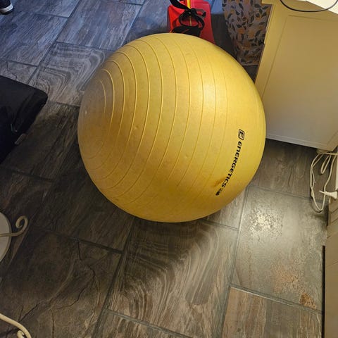 Svart treningsball 75 cm kjøpt på jula for et år siden i forbindelse med bekkenplager i graviditet. Brukt til å sitte på ved bordet etc.