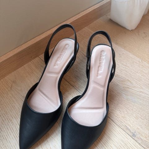 Carvela Kurt Geiger hæler i brun skinn, størrelse 38. Skoene har høy hæl og åpen tå, med to brede stropper over foten og en åpen hælkappe. Passer til formelle og uformelle anledninger.
