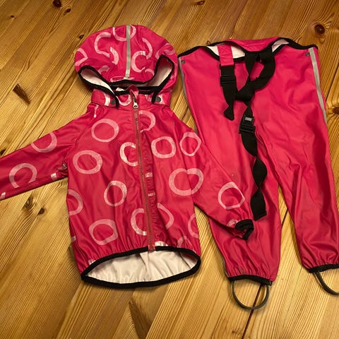 Reima barnedress i størrelse 80, farge rosa, laget av polyester. Passer for jenter. Dressen består av jakke med hette og bukse med seler, designet for barn. Hetten er avtagbar.