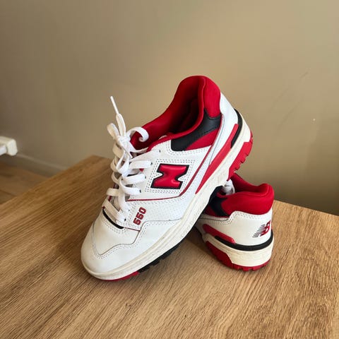 New Balance 550 sneakers joggesko i størrelse 44. Skoene har en kombinasjon av hvitt, rødt og svart materiale. Designet for komfort og daglig bruk, brukt så selges billig.