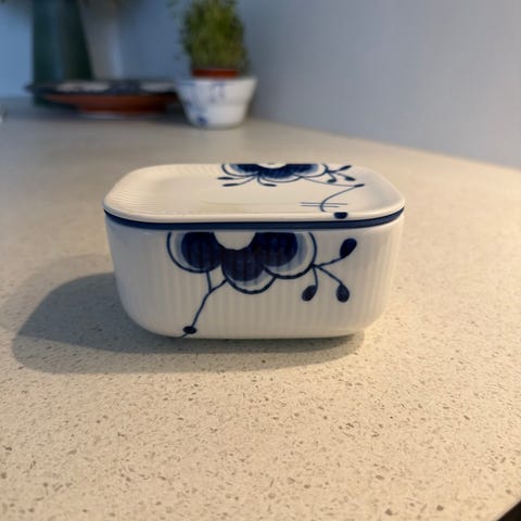 Ingen skader på hverken smørboksen eller lokket, MEN smørkoppen har misfarging på kantene øverst. Se bildene. Har ikke gått vekk med vanlig vask