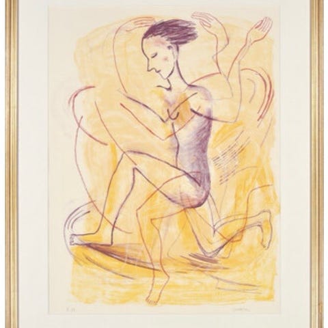 Spennende bilde av en atletisk person i full strekk. Tusj, blandingsteknikk.