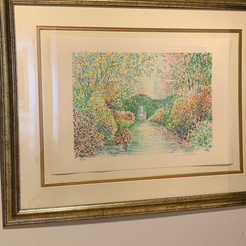 Utydelig skrift nederst (synlig i UV-lys). "Gratulerer med 33 års dagen 92. Klem fra Liv Ellen (?). Yttermål ramme: 70 x 50 cm. Kan sendes.