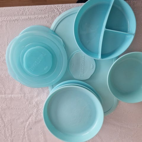 Blå twistshake click-mat mini, 1 rosa tallerken, 1 oransje tallerken, 1 blå tallerken og 2 blå skåler. Følger med lokk til alt.