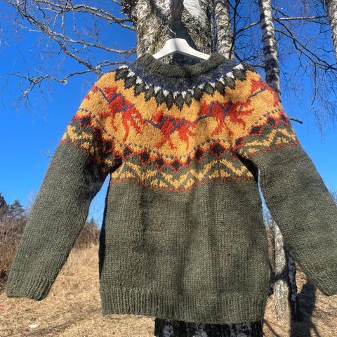 Genseren er strikket av meg i 100 % norsk ull fra Hillesvåg (Blåne og Troll) – et garn som er kjent for varme, slitestyrke og vakre farger.