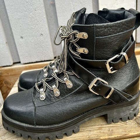 Det står str 37 på innsiden - passer også til meg som er en 38 str. Glidelås holder foten på plass.