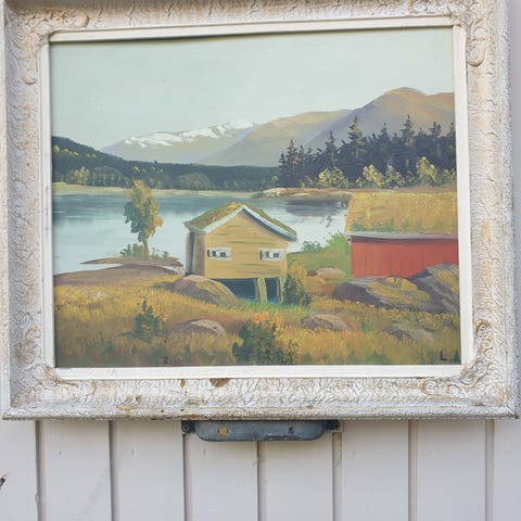 Olje på lerret. Signert nede til høyre: "N. Lundh -92". Vakker ramme. Minimal avskalling nederst i vannet og et lite punkt i trærne. Yttermål ramme: 50 x 72 cm. Kan sendes.